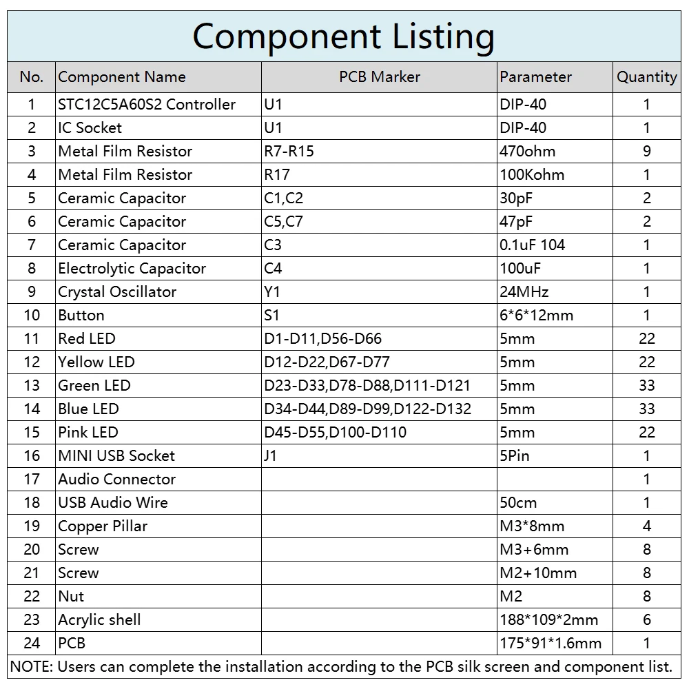 그것은 빨강/황색/녹색/파랑/분홍색 깜박이는 5 색 LED 음악 스펙트럼 디스플레이 DIY 키트입니다. 디스플레이 효과는 입력 오디오에 따라 자동으로 변경되어 매우 화려한 효과를 제공합니다.