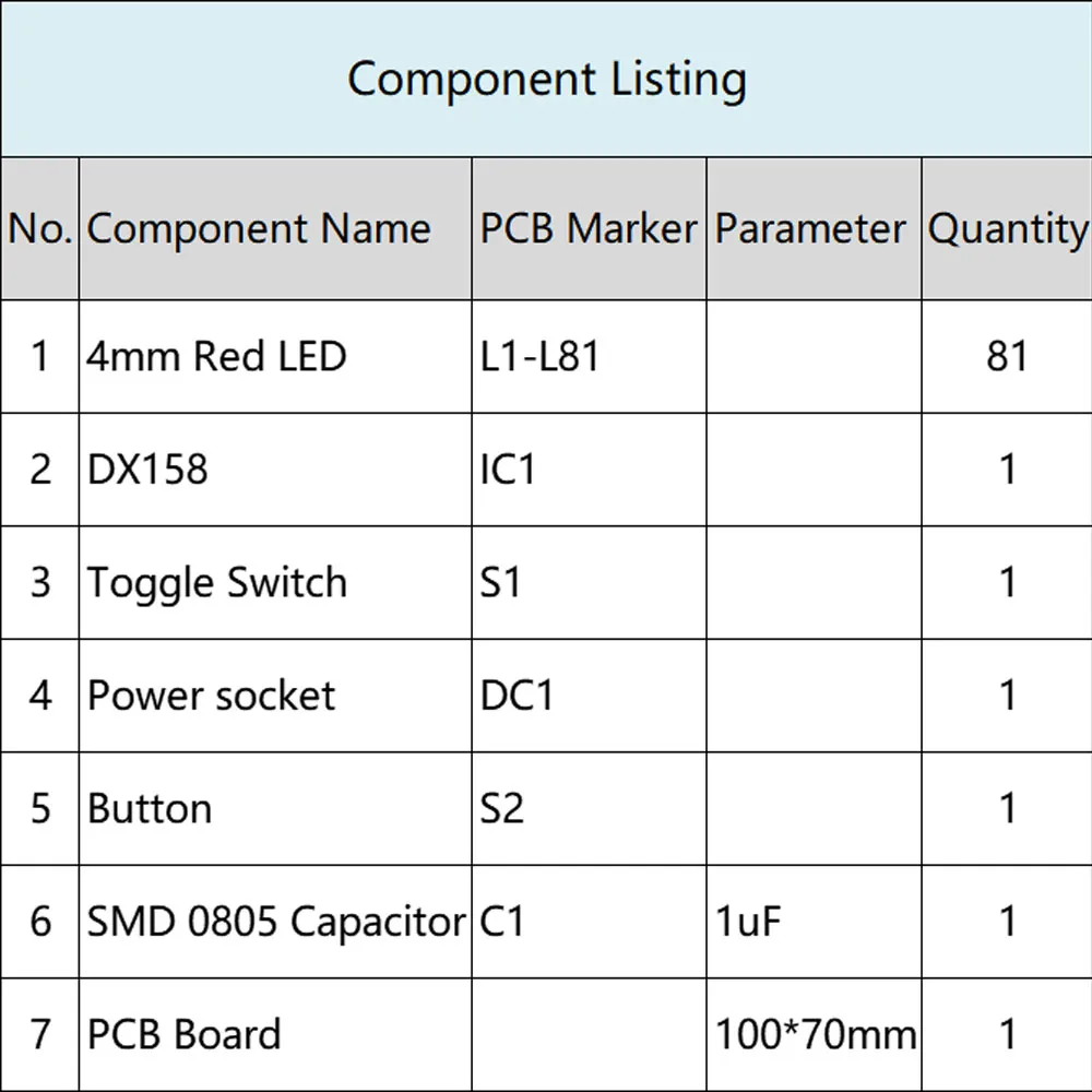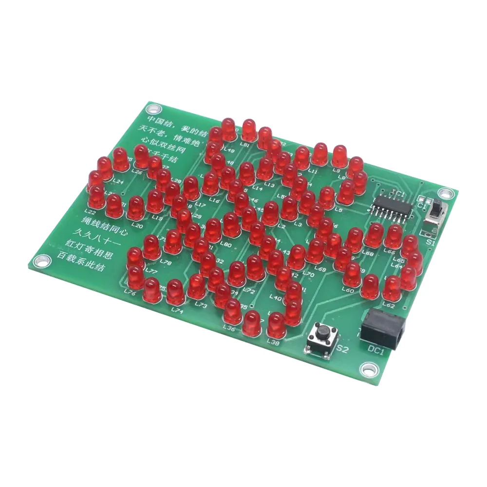 이것은 81 개의 LED로 구성된 중국 매듭 용접 키트로, 필요에 따라 MCU 프로그램에 의해 구동되고 조명됩니다. MCU에는 자체 발진 및 리셋이 있으며 회로에는 여러 개의 조명 제어 모드가 있습니다. 시동 후, 그것은 원형으로 재생됩니다. 버튼을 누르면 깜박이는 속도가 원형으로 바뀔 수 있습니다. 버튼을 누를 때마다 속도가 1 기어 빨라지고 가장 빠른 속도로 버튼을 누르면 가장 느린 기어로 돌아갑니다. 이 사이클에서 C1 은 일반적으로 설치할 필요가없는 대기 필터 커패시터이며, 사용의 효율성에 영향을 미치지 않습니다.
