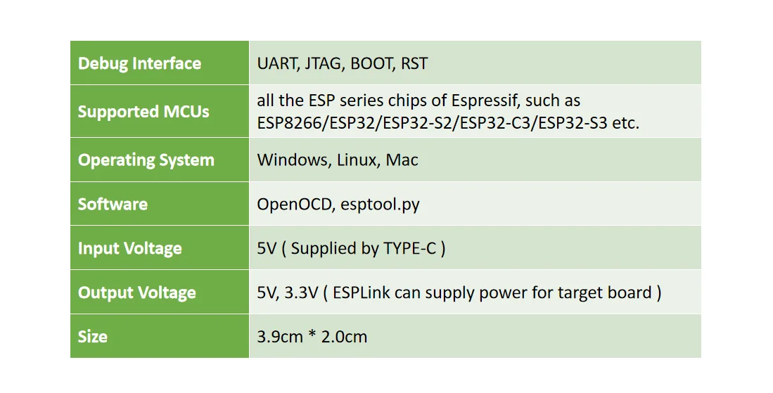 ● ESP8266/ESP32/ESP32-S2/ESP32-C3/ESP32-S3 등과 같은 Espressif의 모든 ESP 시리즈 칩 디버깅을 지원합니다.