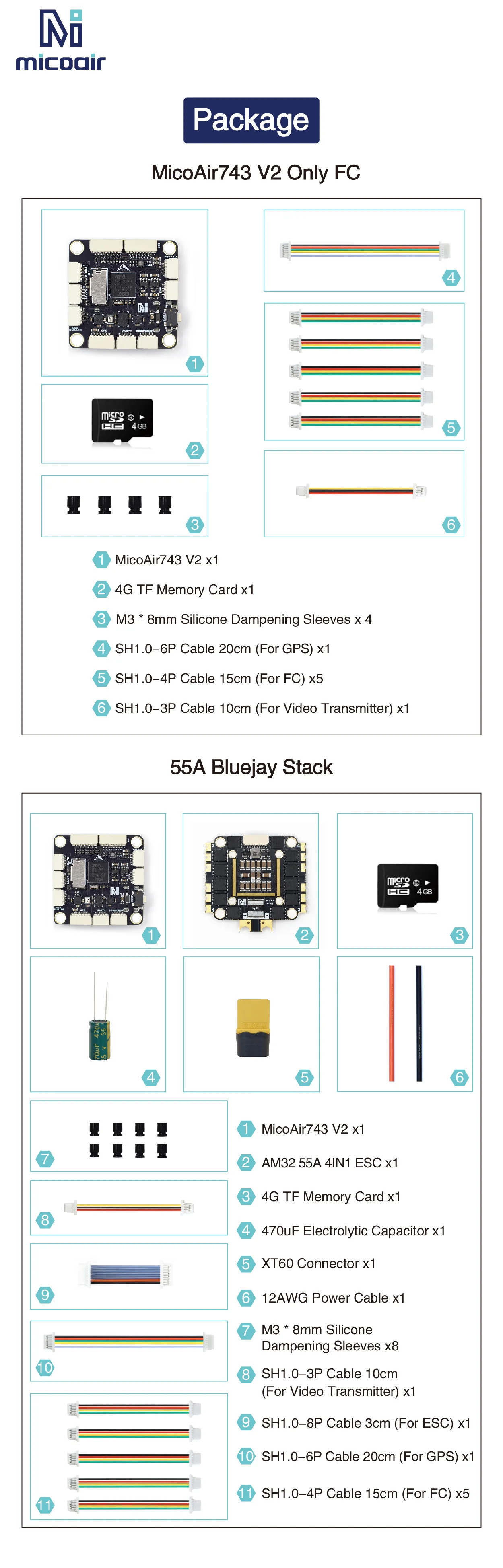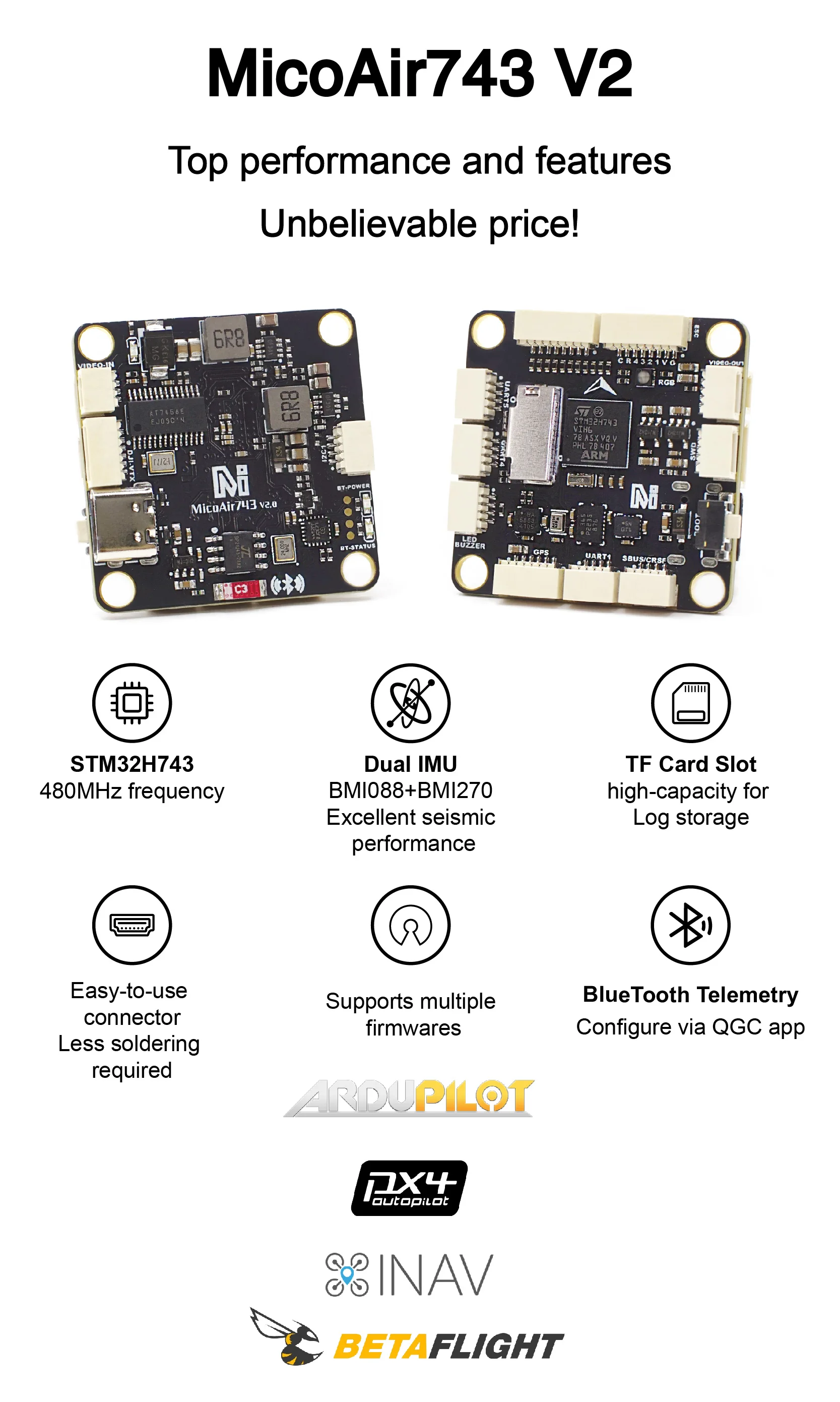 MicoAir743 V2 비행 컨트롤러 (듀얼 IMU 탑재 블루투스 파라미터 조정 지원 PX4 펌웨어 호환) [MicoAir-24]
